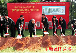 澳门中华总商会建造"澳门回归纪念亭"动土仪式三十日在澳门何贤公园举行,澳门特区首任行政长官何厚铧(左五)、澳门中华总商会会长马万祺(左四)、新华社澳门分社副社长宗光耀(左三)等嘉宾出席。