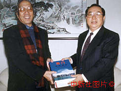 中国大百科全书出版社与澳门基金会合作编纂的《澳门百科全书》,是由近百名专家历经三载完成。中国大百科全书出版社社长单基夫,近日在北京向新华社澳门分社社长王启人(右)赠送了该书。