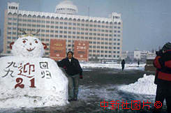 乌鲁木齐的一场大雪给市民生活带来了许多乐趣,人民广场上迎接澳门回归倒计时牌前出现了一个醒目的“迎澳门回归雪人”。 作者:闫文陆