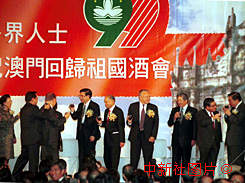 香港各界十八个团体十五日在会议展览中心举行盛大酒会,特首董建华、外交部驻港特派员公署特派员马毓真、新华社香港分社社长姜恩柱等嘉宾举杯相互祝贺回归澳门祖国。 中新社传真洪少葵摄