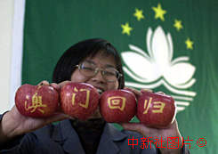 产自陕西黄土高原的延安苹果,被映上 庆祝澳门回归字样作为礼品送抵澳门。中新社数码传真 王瑶摄