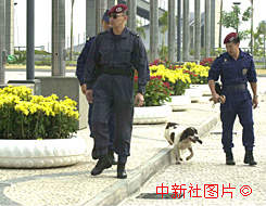 澳门特警队员带领警犬在政权交接场地四周巡罗检查。