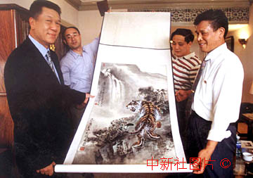 北京著名画家李广利(右一)近期在北京向澳门特区行政长官何厚铧(左一)赠送了一幅国画《大展雄风》,以表示他对澳门的美好祝愿。