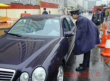 澳门警察十八日冒雨在政权交接场地周围检查车辆,疏导交通。中新社数码传真