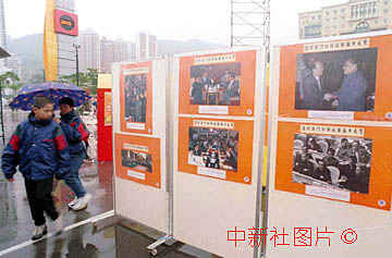 香港岛各界联合会十八日冒雨在维多利亚公园举办"庆祝澳门回归祖国图片展览",展览展示了中华民族从此洗脱屈辱的历程和回归前的澳门风貌。中新社传真杨佐桓摄