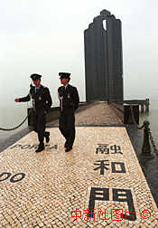 澳门警察在海滨纪念建筑融和门前执勤。中新社传真 彭振戈摄