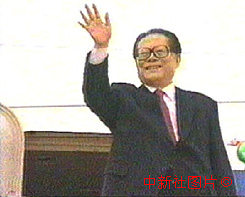 中国国家主席江泽民今天中午十二时许乘专机抵达澳门,步出机舱的一瞬向欢迎的人群招手致意。中新社传真