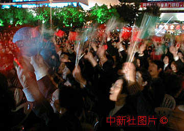 19日晚,珠海市举办多台文艺晚会迎接澳门回归,图为九洲城市民在欢呼20日零时的到来。作者:萧琨