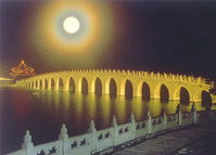 | 欣赏十七孔桥之美,有四时之美,有晨昏之美,但更重要的是从不同角度去领略,即站在园中各处望桥,和站在桥上望园中各处。比如站在桥上眺望万寿山,这是十七孔桥的最好镜头。扶着汉白玉桥栏,欣赏万寿山,水波、雕栏、长廊、绿树、崇阁、黄瓦、青天、白云,浑然一体,如世界上真有“蓬莱仙山”,也不会胜过这里。北京春天多风,在风天站在桥边,望着昆明湖动荡的波涛,似乎万寿山也会浮动起来,一线白石栏杆也成为一条幌动着的珍珠项链了。二是站在万寿山麓看“十七孔桥”,这在庚子前自然是办不到的,但颐和园开放之后,这便成为游人不可忽略的一个美丽的画面了。从知春亭一带,往北,再折而西,沿湖走,随处都能望到这一卧波长桥,宜晴,宜雨,宜雪,宜月,无时不是静静地卧在那里,如果你能坐船在湖中欣赏她,那就更美了。读者中有谁知道吗?她是无独有偶的,她有个“姐姐”,在苏州“石湖”,“石湖串月”的“杏春桥”,同她的造型一样,只是没有她华丽。如果说“十七孔桥”是“宫廷妃子”,那石湖杏春桥该是江村的浣纱女了吧。